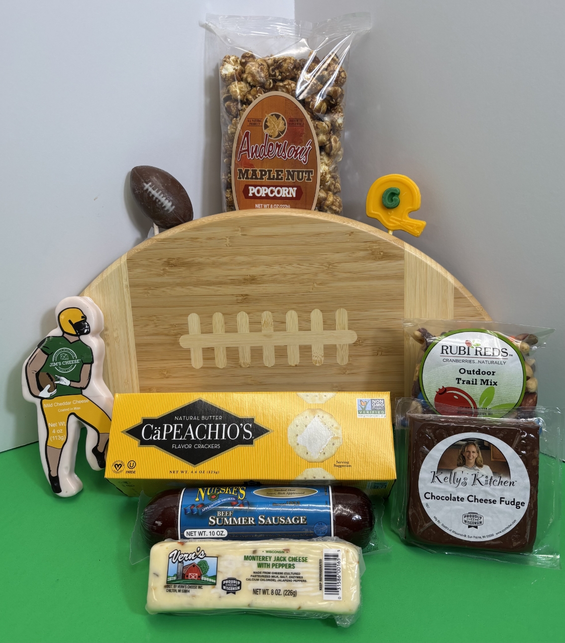 This beautiful bamboo football shaped cutting board is perfect for serving up cheese, sausage, crackers and fudge at game time. There is specialty popcorn included for the sweet tooth as well as two chocolate pops.