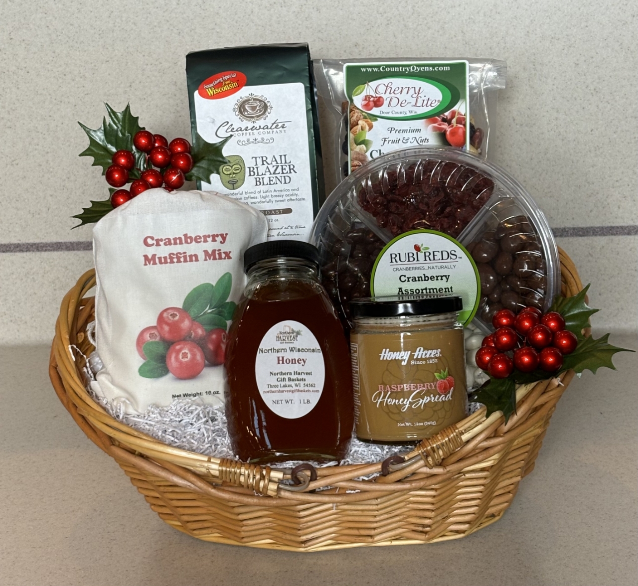 A beautiful willow gift basket is loaded with outstanding Wisconsin gourmet products. A perfect gift for friends and co-workers or family members.